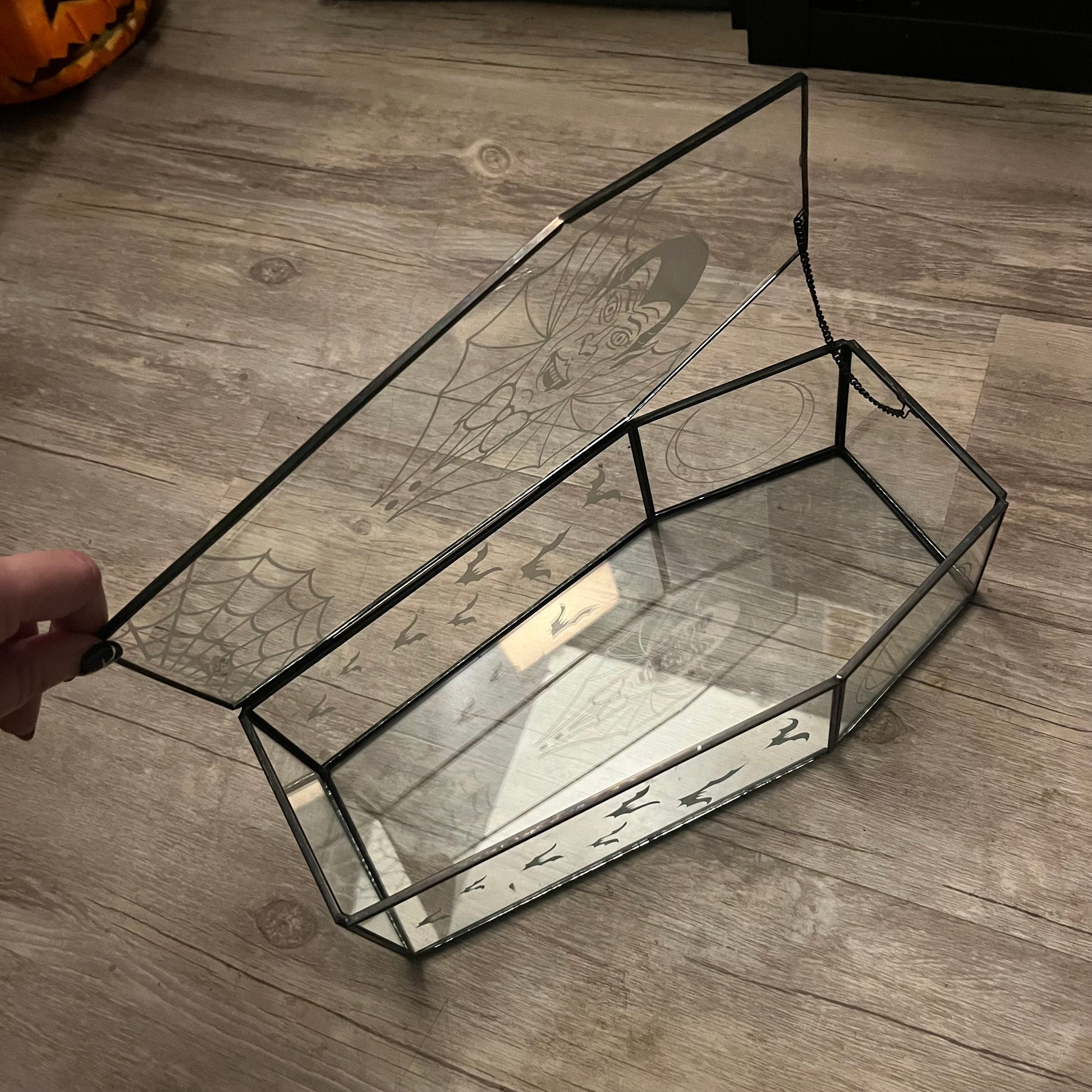 12” x 5” glass coffin with vampire, spiderweb, moon and bat etchings. 3.5” deep